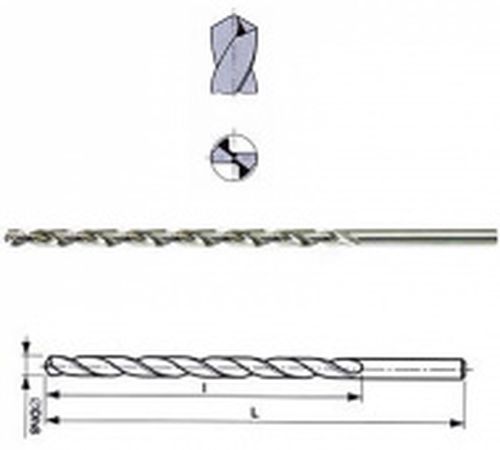 Vrták s válcovou stopkou extra dlouhý 08,30 mm HSS ČSN 3001 DIN 1869 RN Zvlášť dlouhé vrtáky doporučené k vrtání hlubokých děr přes vrtací pouzdra v součástkách z nelegované i legované oceli, ocelolitiny do pevnosti 900N/mm2, šedé, temperované i tvárné litiny, spékané oceli apod. Při vrtání hlubokých děr je nutno zabránit ucpávání drážek častým vyplachováním vrtaného otvoru. S ohledem na špatný přívod řezné kapaliny je však nutné snížit doporučené řezné podmínky. Bez povrchové úpravy. Ostřeno způsobem podbroušené kuželové plochy se zkrácením příčného břitu - typ C. Vyrobeno vybrušováním a přesným frézováním.